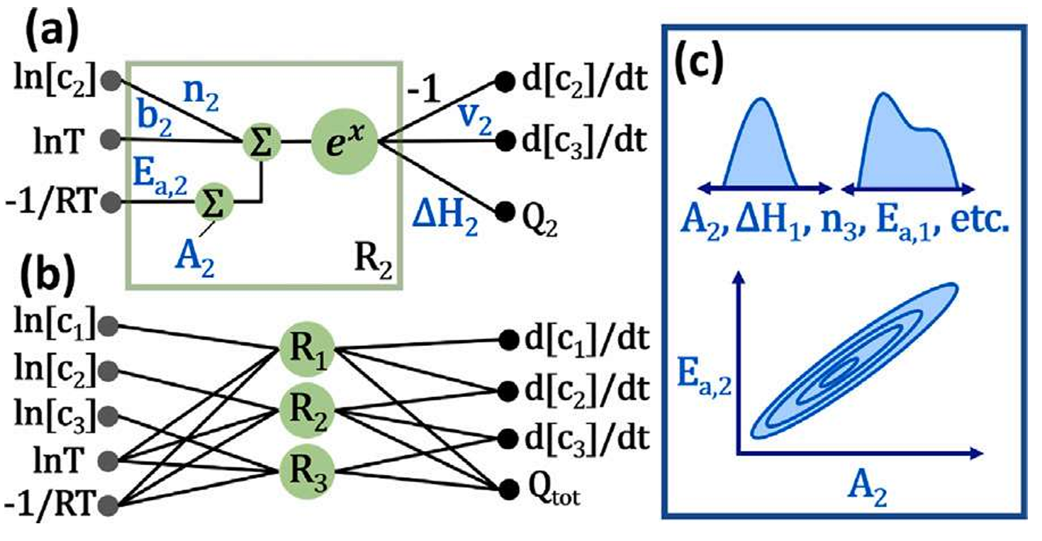 CRNNs are specialized neural networks that directly encode the Arrhenius and mass action laws. When trained, they not only accurately reconstruct the training data like a standard neural network, but also provide the exact Arrhenius and mass action parameters that describe the reconstructed system. They enable modeling in combustion systems, battery thermal runaway simulations, biological systems, and more, with optional uncertainty quantification capabilities.